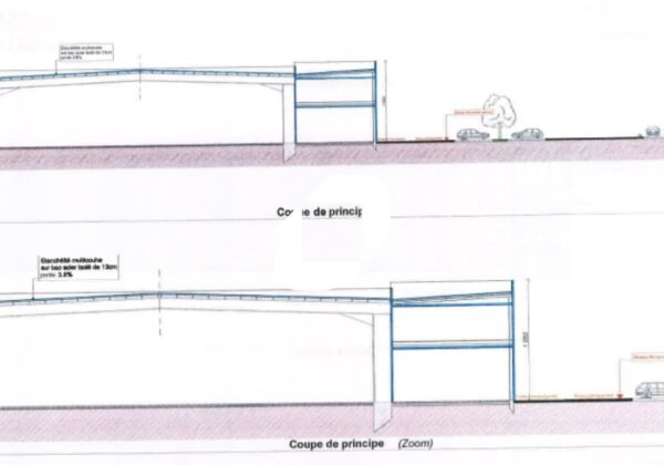 . Façade mur rideau. Accès véhicules légers