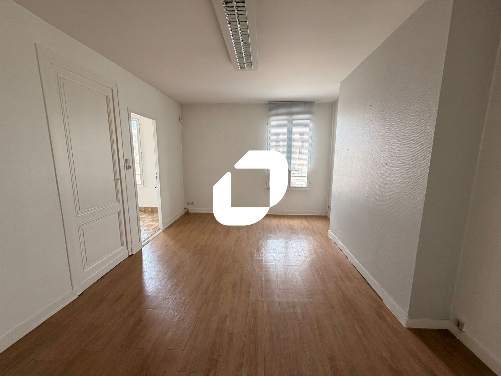 Au RDC, une pièce d'accueil d'environ 37 m², deux espaces cloisonnés, un sanitaire. A l'étage, trois bureaux, une salle d'archives et un point d'eau.