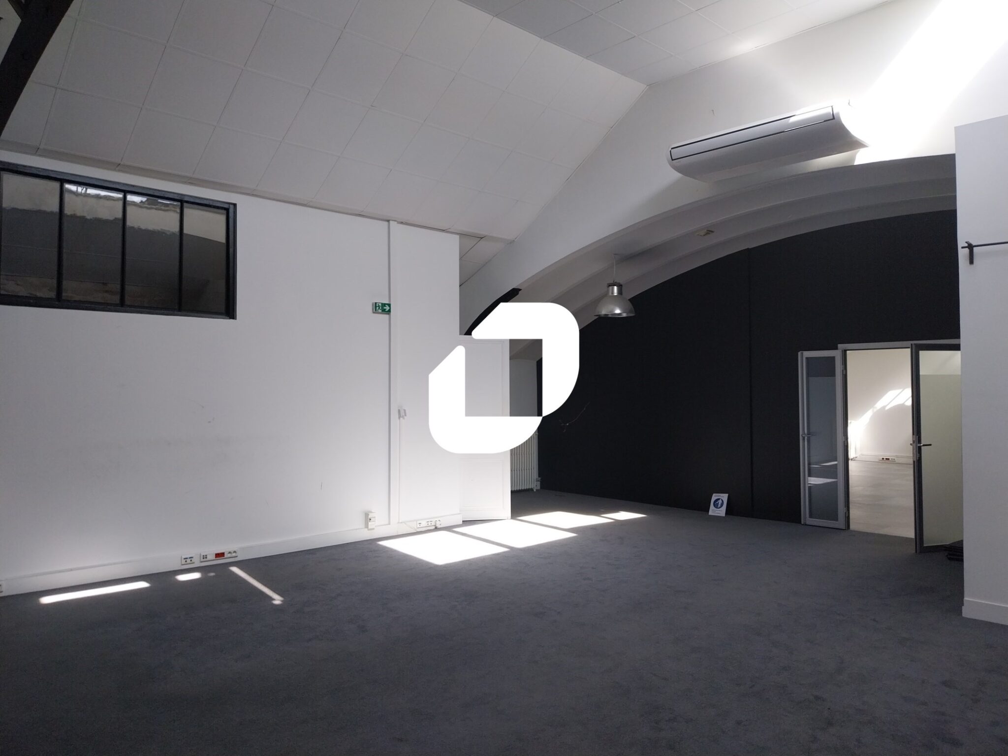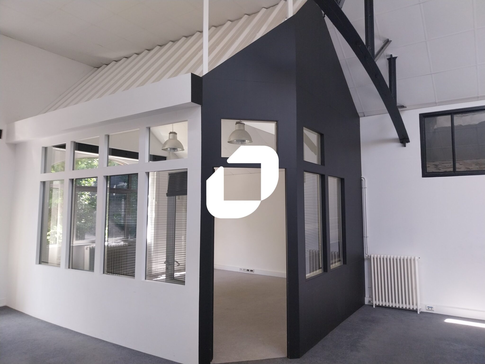 . Brut de béton . Bureaux fermés et lumineux. Bureaux partiellement cloisonnés