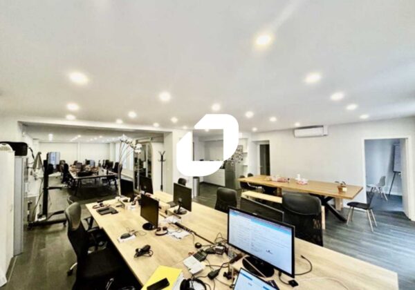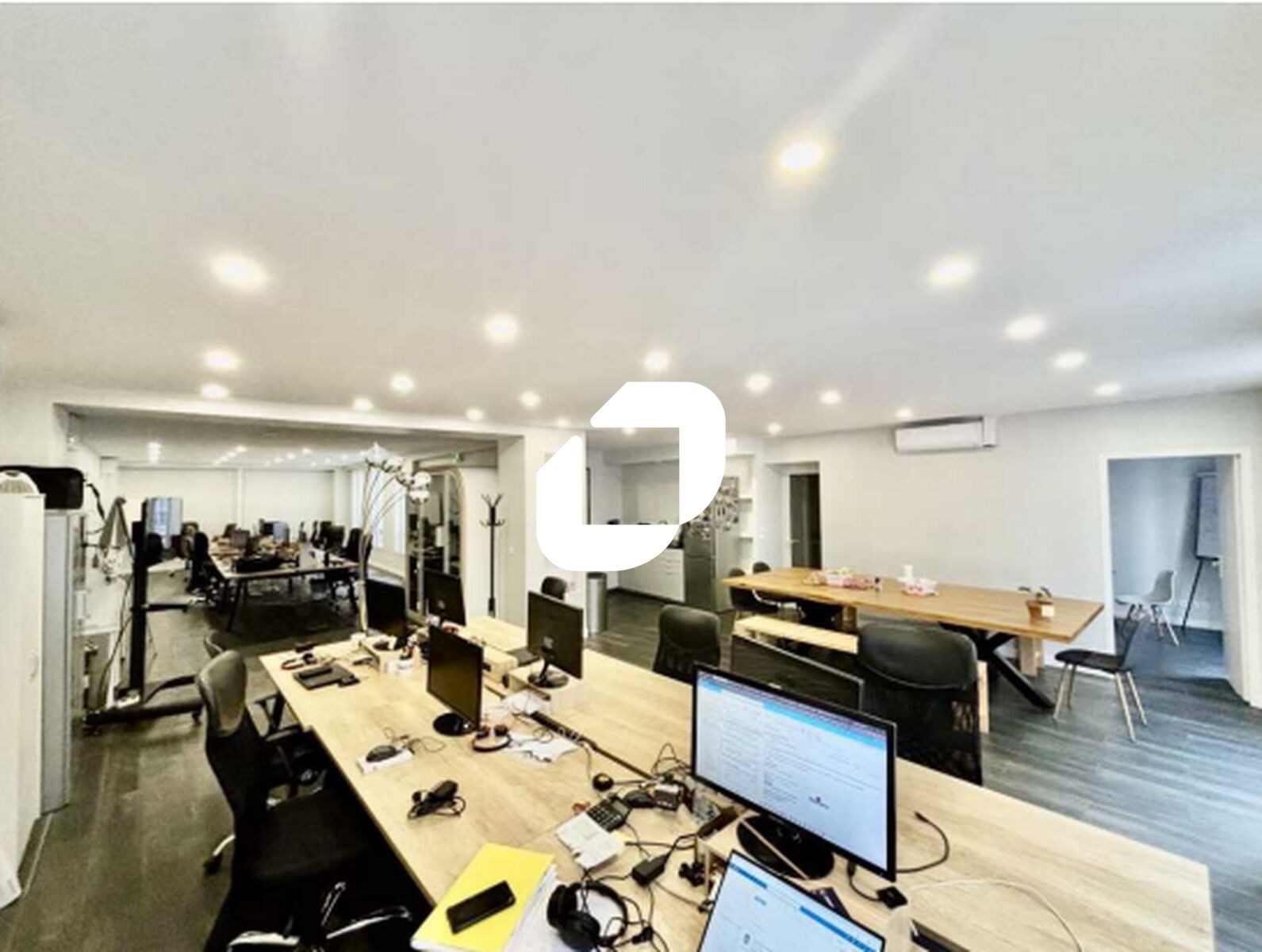 . Digicode . Surface aménagée en une entrée, 1 grand espace ouvert, 2 salles de réunion, un coin cuisine et 2 WC