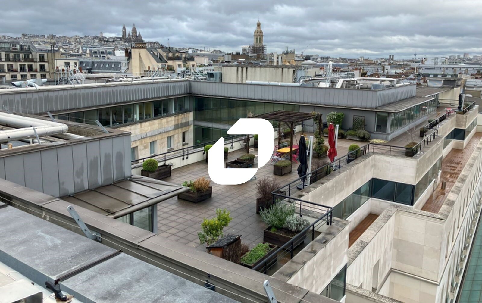 . Terrasse côté cour avec vue sur le dôme du Printemps . Sol moquette