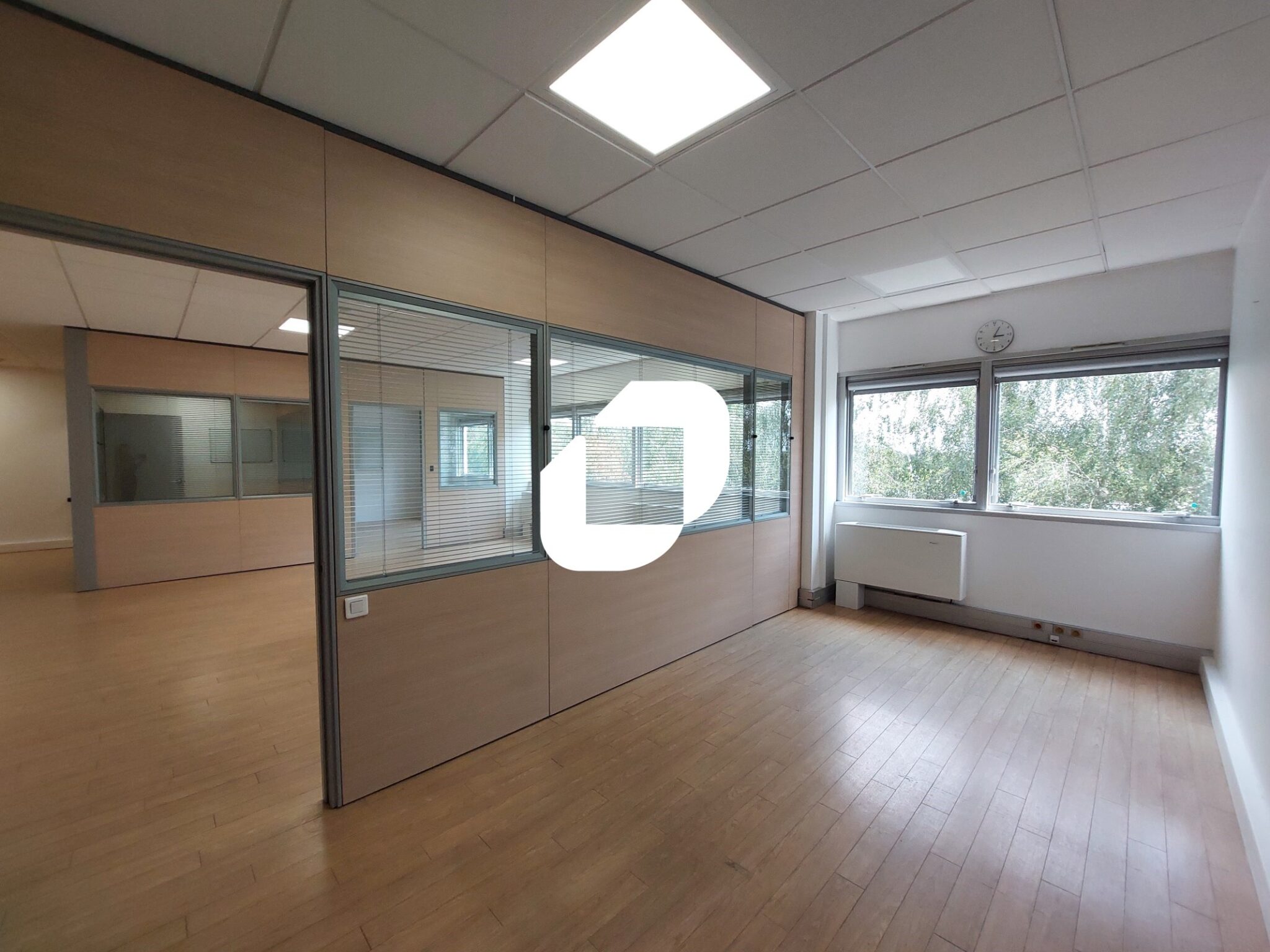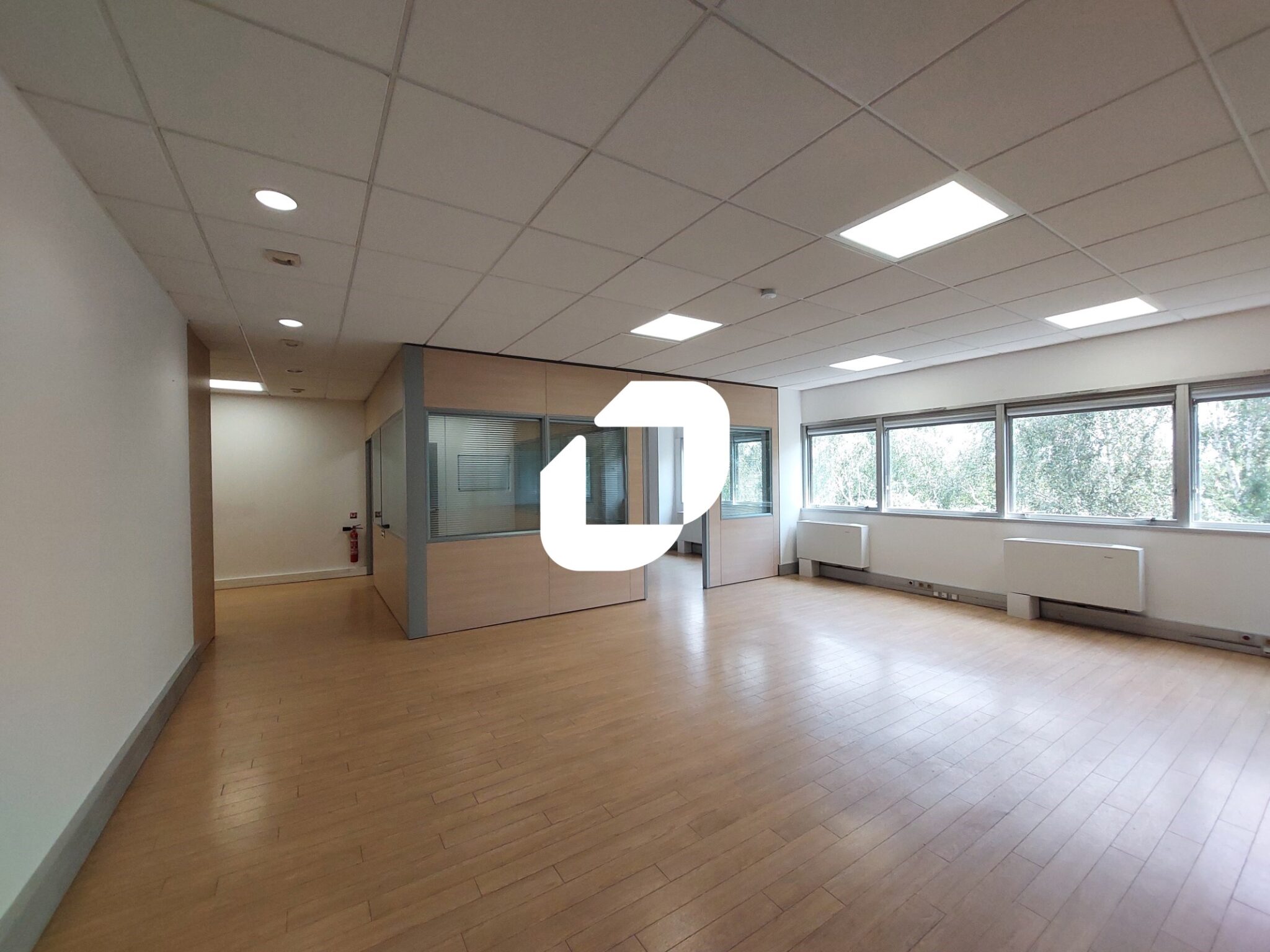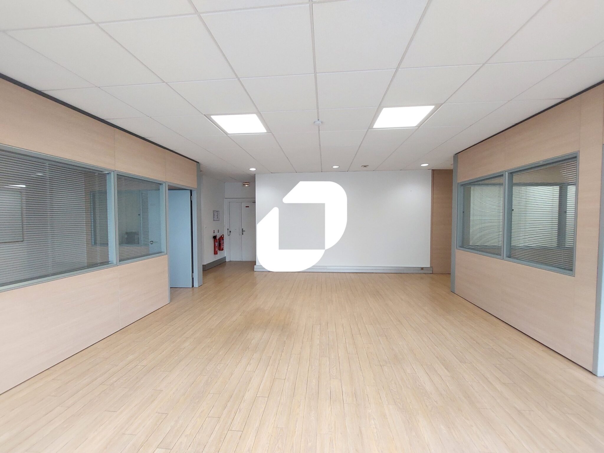 . Sol en parquet vinyle ou moquette, faux plafonds avec pavés LED