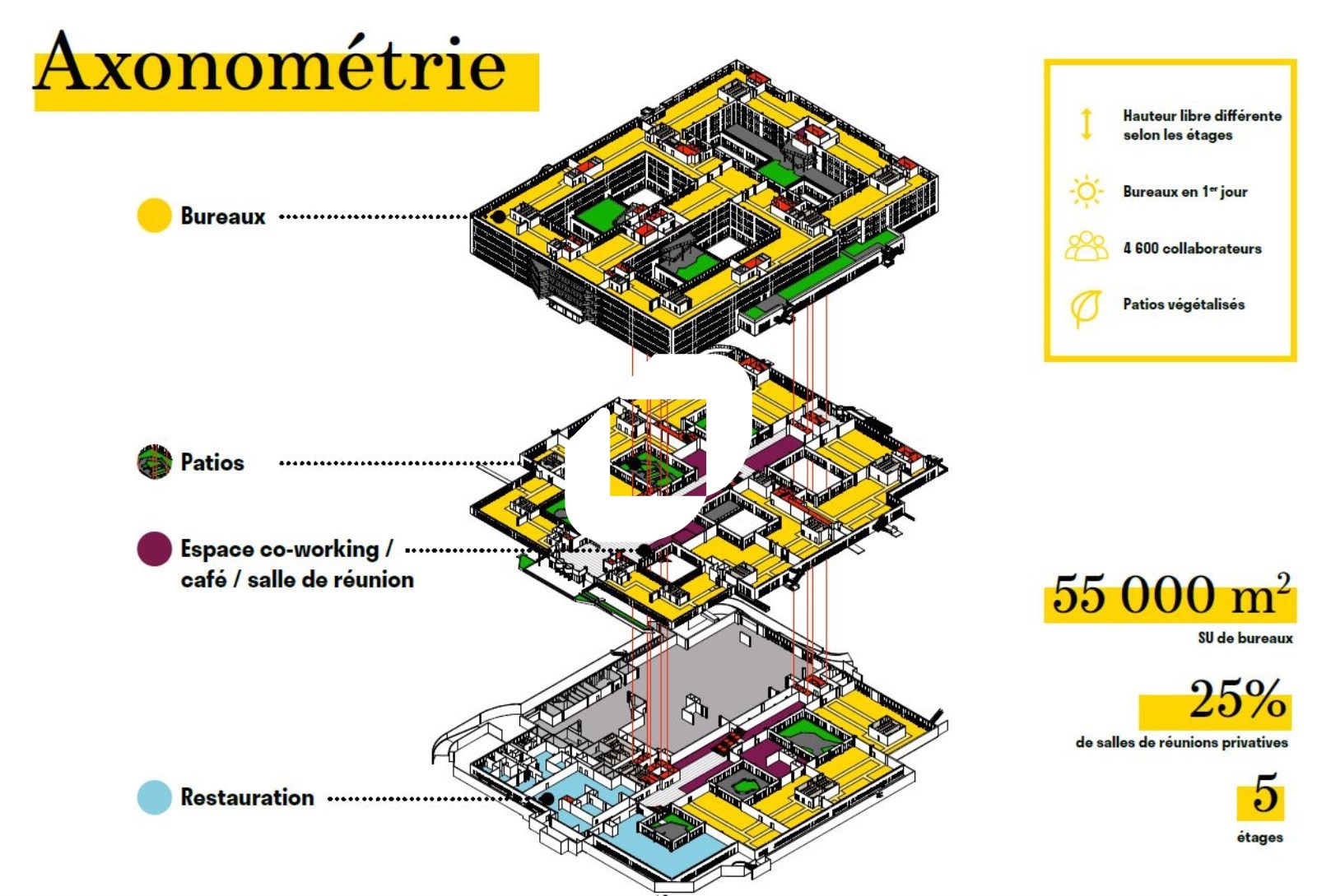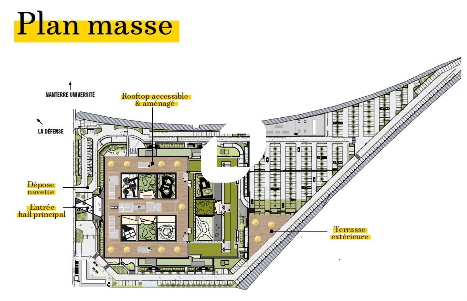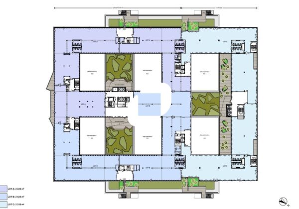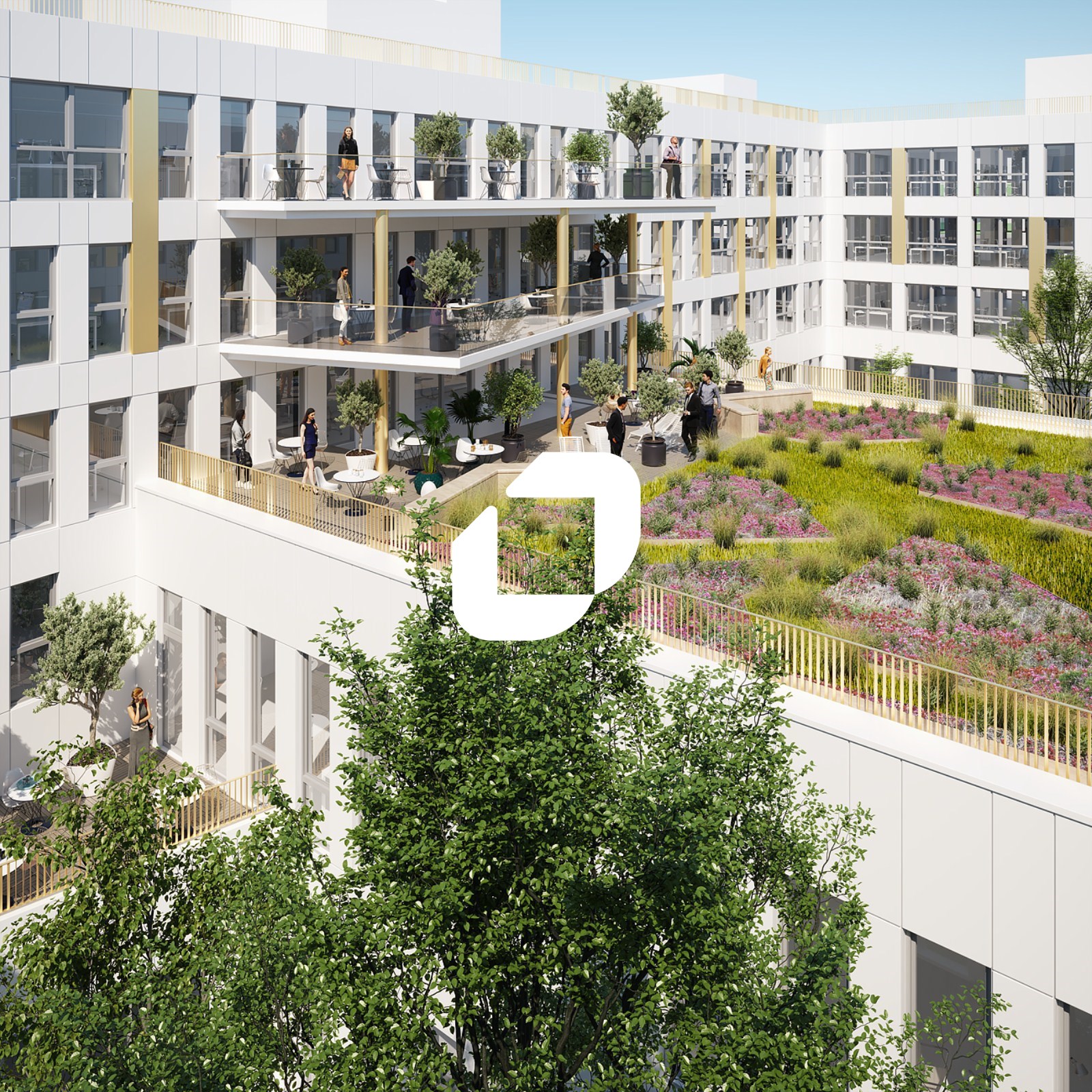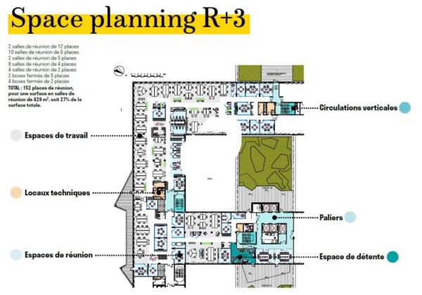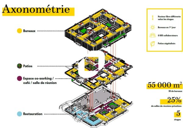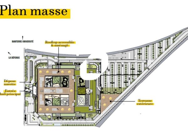 . Patios et terrasses accessibles à tous les étages pour une surface totale de 3 900m² : 6 patios végétalisées au RDC et au RDJ - Terrasse végétalisés au R+3 - balcons à tous les étages - Jardin paysager dans les patios et l'entrée principale