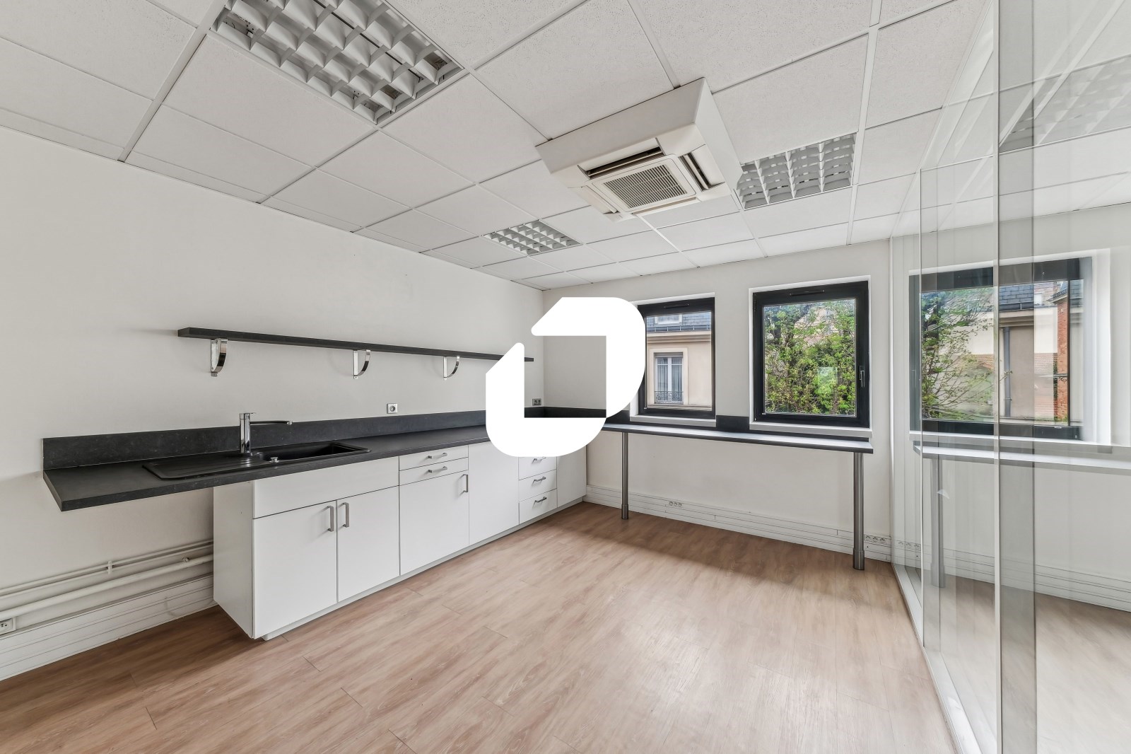 . Plateau composé d'un acceuil, espace ouvert, plusieurs bureaux cloisonnés, un espace cuisine, salle de réunion