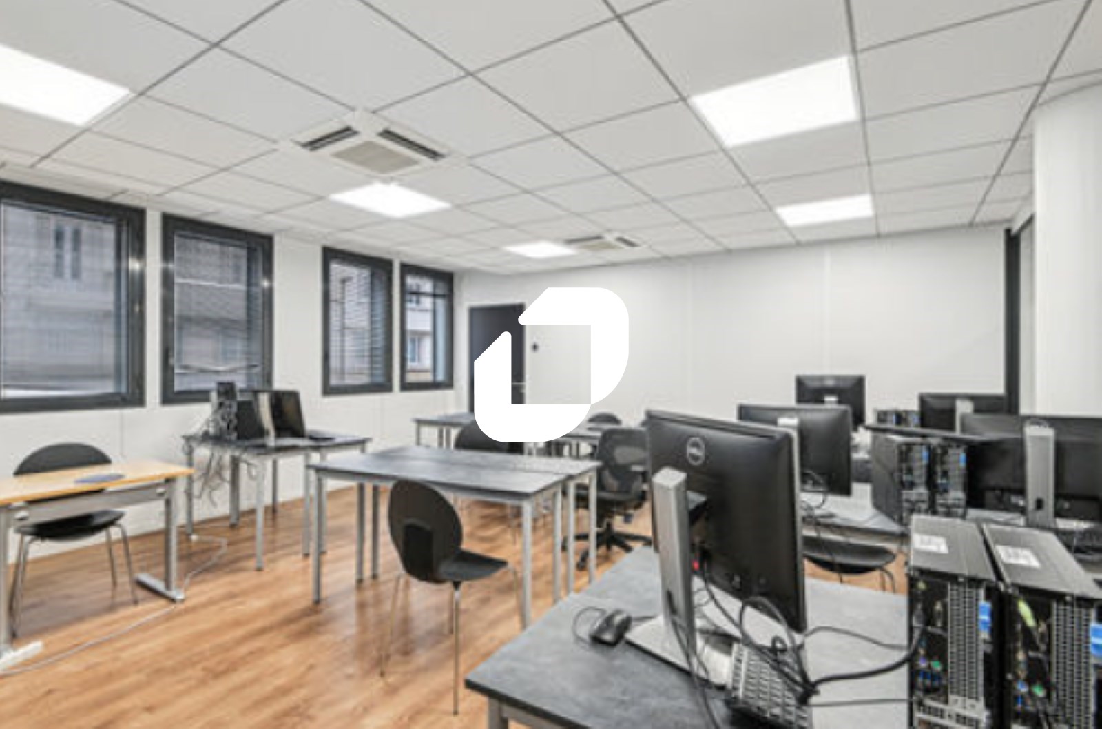 Bureaux cloisonnés en salles de classes pouvant être retravaillés en espace ouvert.
