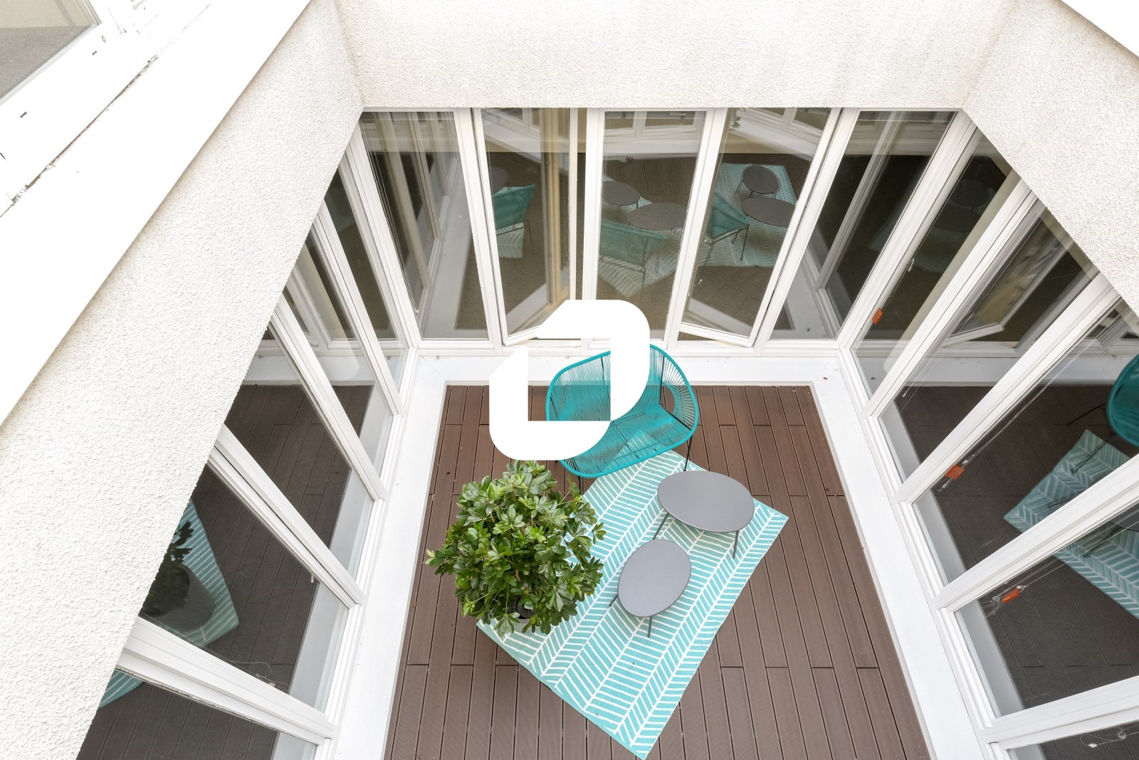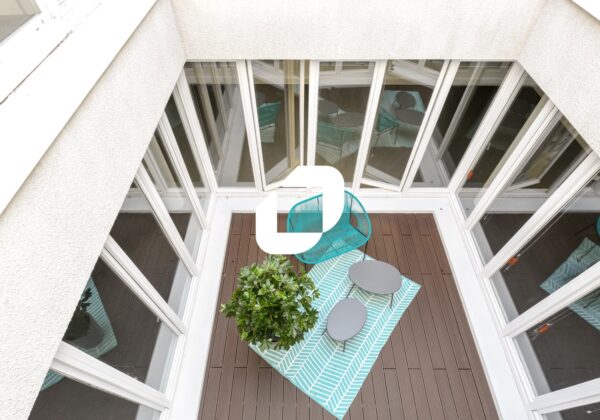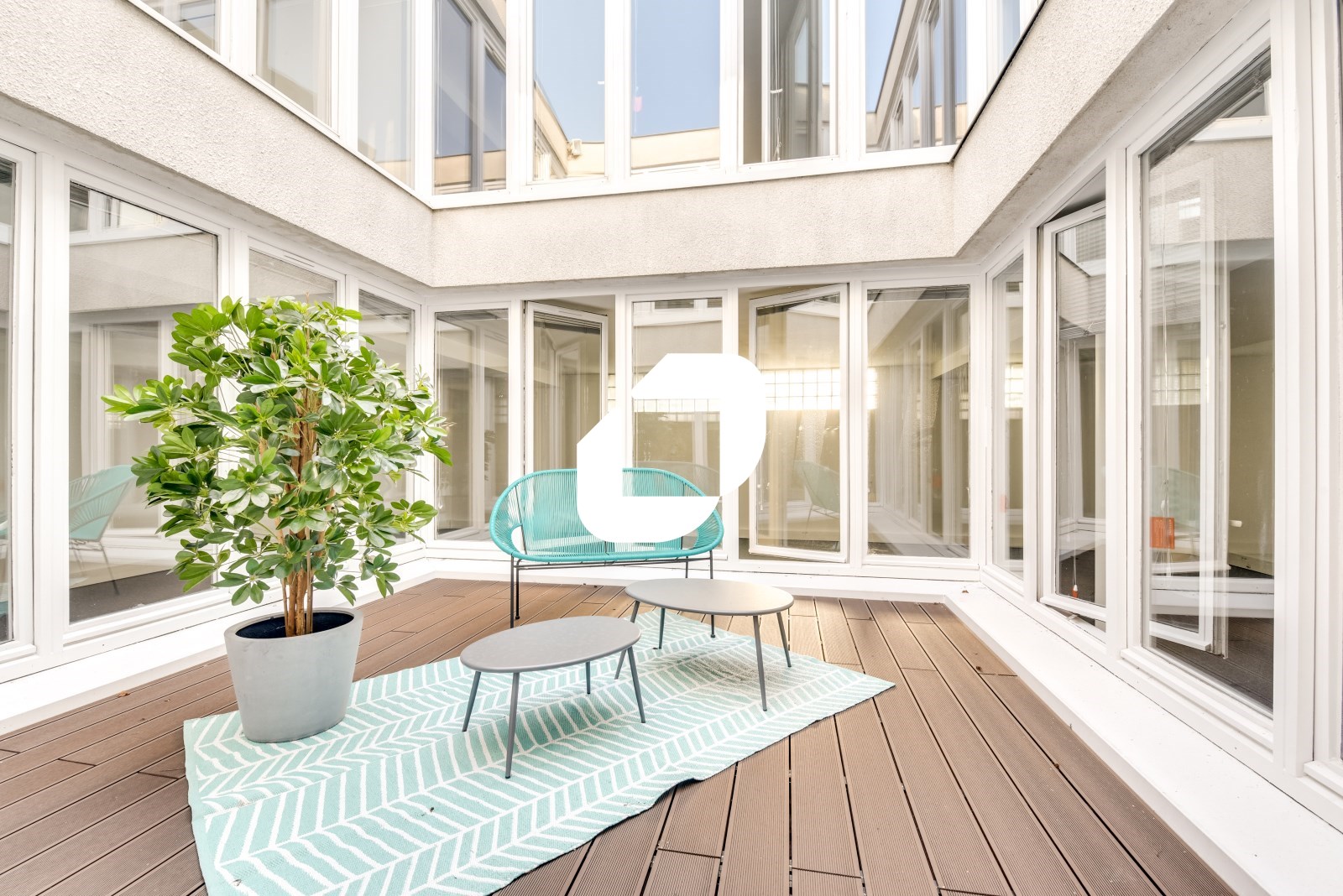 . Patio central permettant un bel apport de lumière et l'aménagement d'une terrasse donnant au lieu un caractère atypique