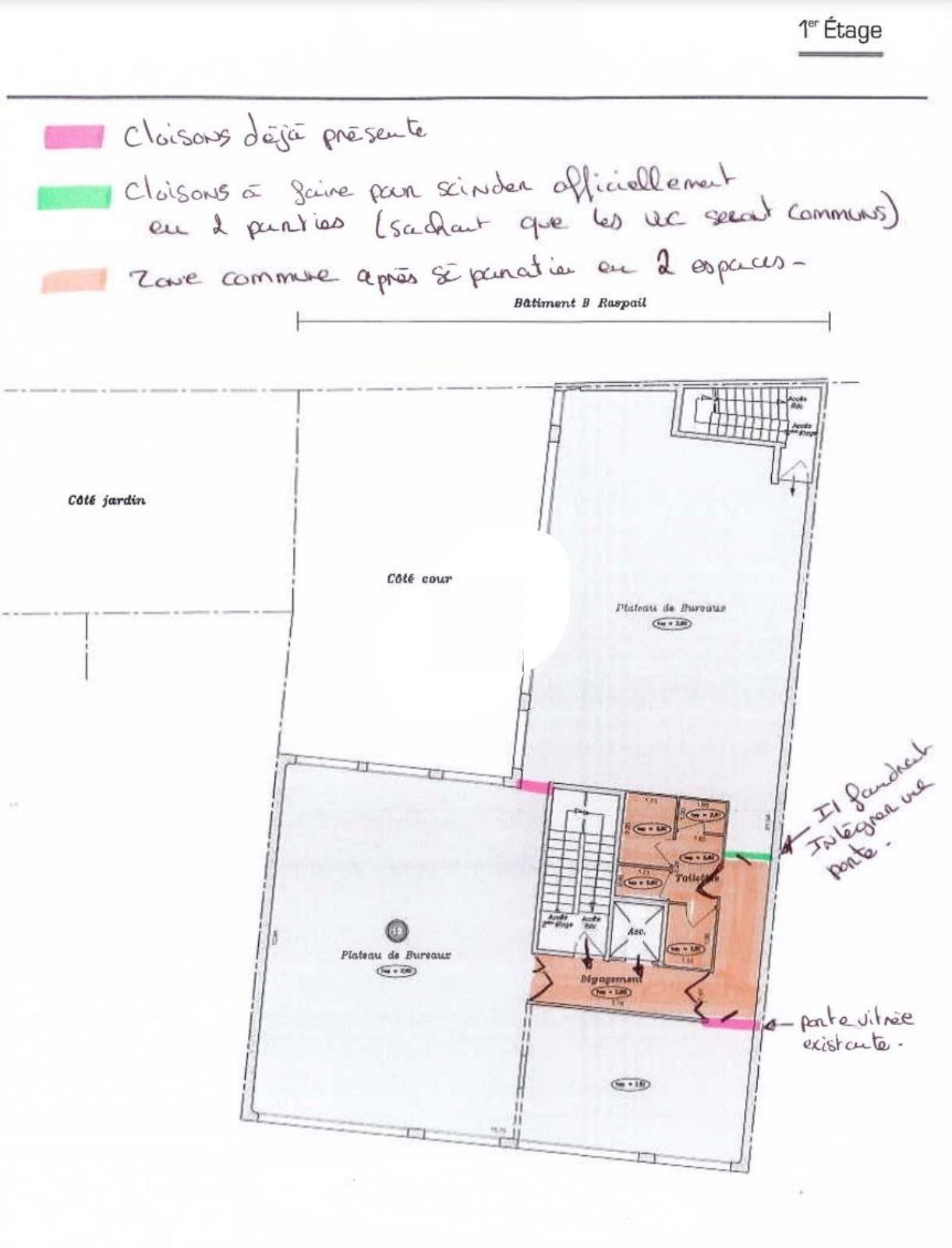 . Sanitaires doubles (parties privatives si prise à bail d'un plateau complet) sinon en parties communes. Sanitaires PMR
