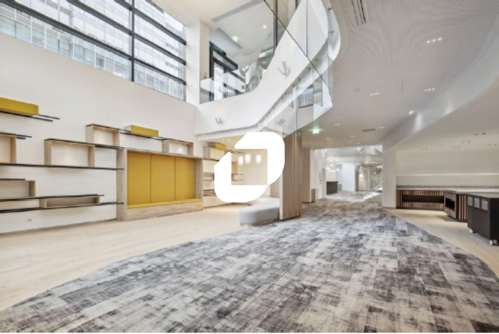 . Escalier hélicoïdal et salles de réunion vitrées en suspension