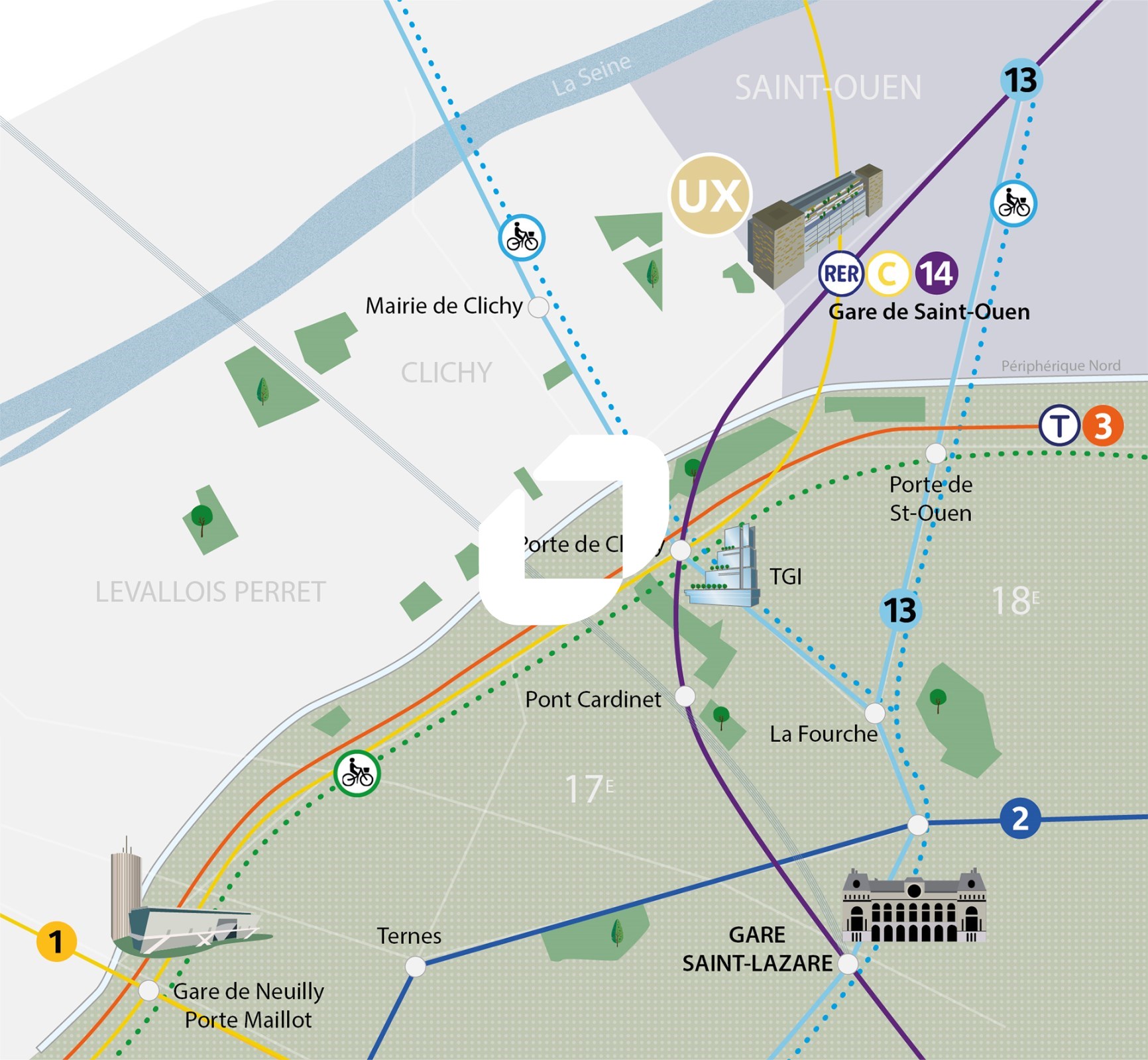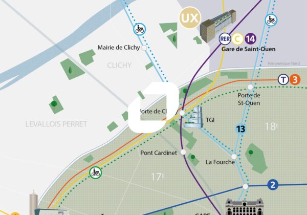 UX est un ensemble immobilier d'environ 18 000m² disposant d'une très bonne localisation dans le quartier Victor Hugo de Saint-Ouen, au pied de la ligne 14 et du RER C. Les services constituent un axe majeur de la restructuration de l'immeuble signé ORY.