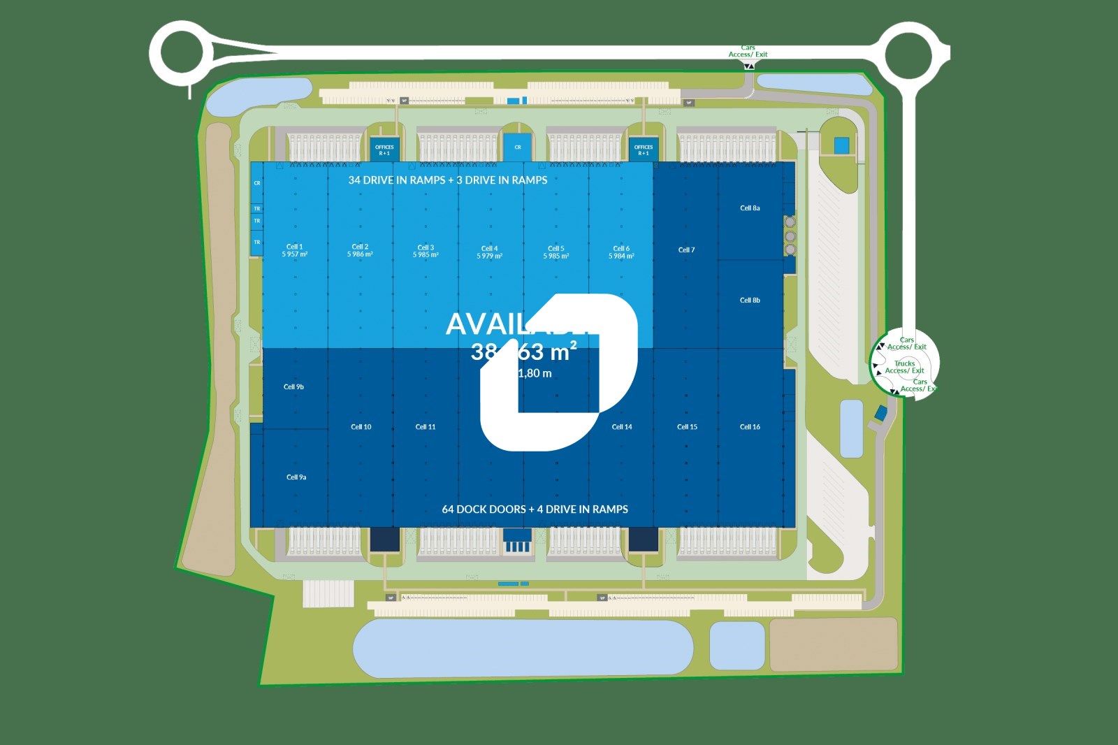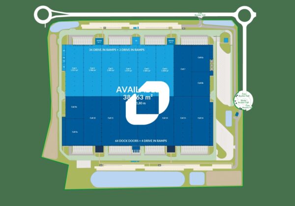 Un bâtiment récent de 2023, clos et sécurisé, avec 34 quais, 3 accès de plain-pied et une hauteur sous poutre de 11,8 m.