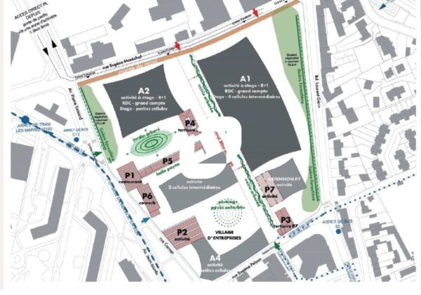 Cellules modulables dès 200 m² à 10 825 m², intégrant tertiaire (15%) et services. Idéal pour 800 emplois.