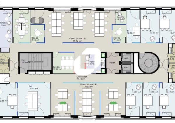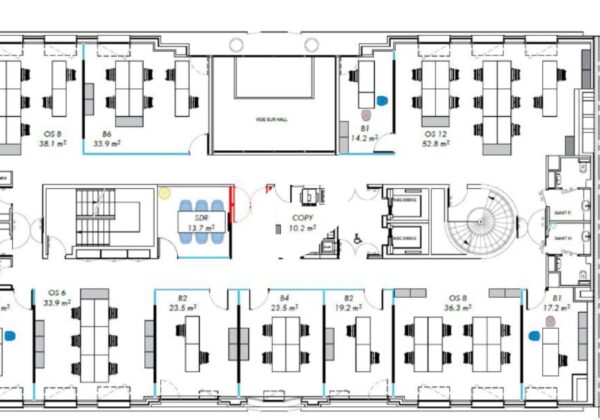Ces surfaces de bureaux sont au 1er et 2e étage d’un immeuble tertiaire disposant d’un accueil, d’une terrasse collective et d’un accès PMR.