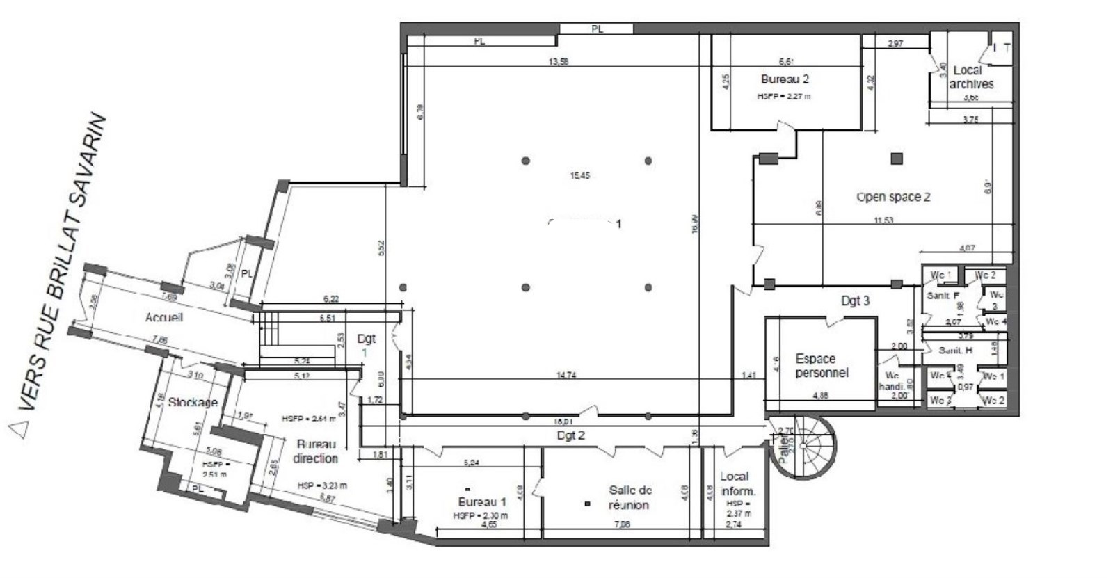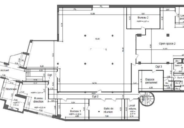. Le local comprend : 1 accueil, 5 espaces de travail, dont 1 salle de réunion, 1 grand open space, 8 sanitaires, 1 cafétaria, 2 locaux techniques et 2 réserves en sous-sol