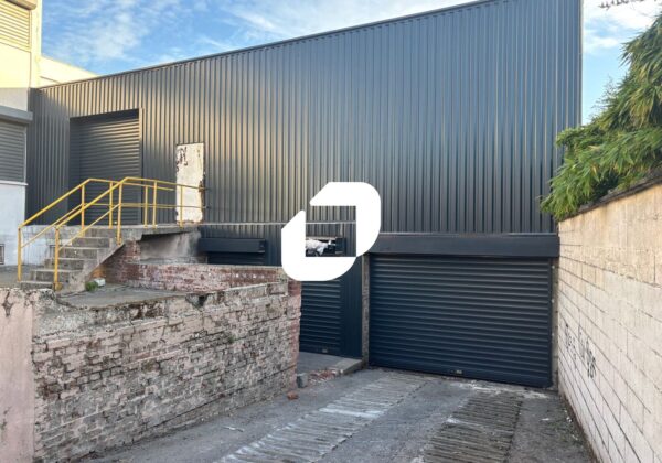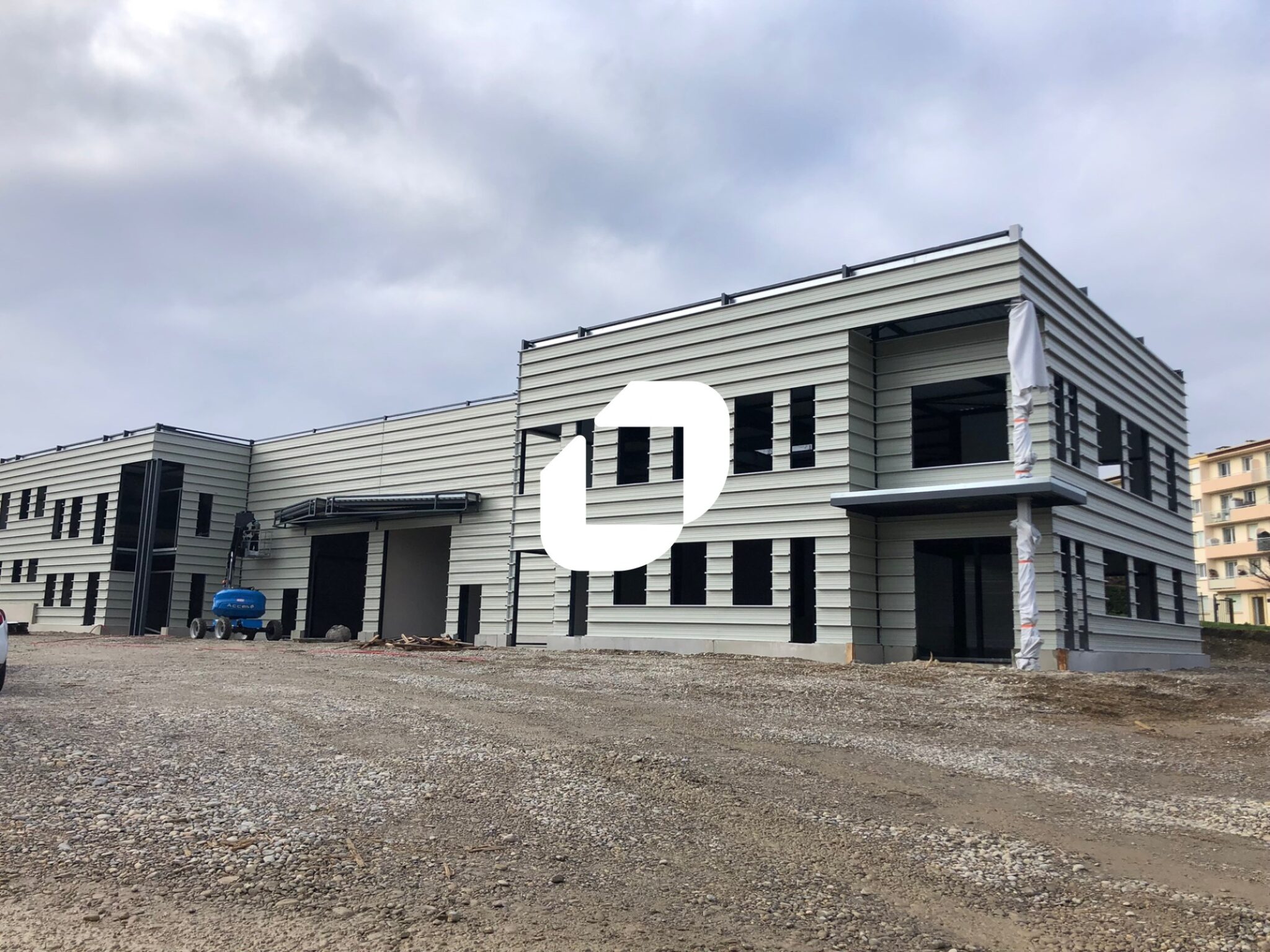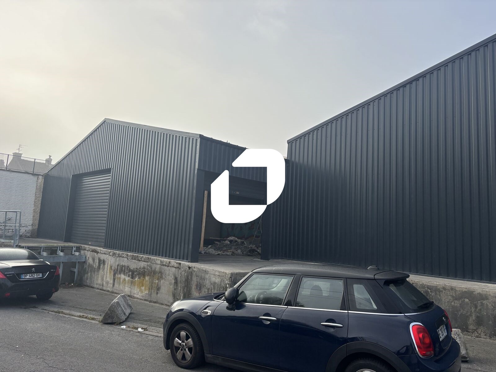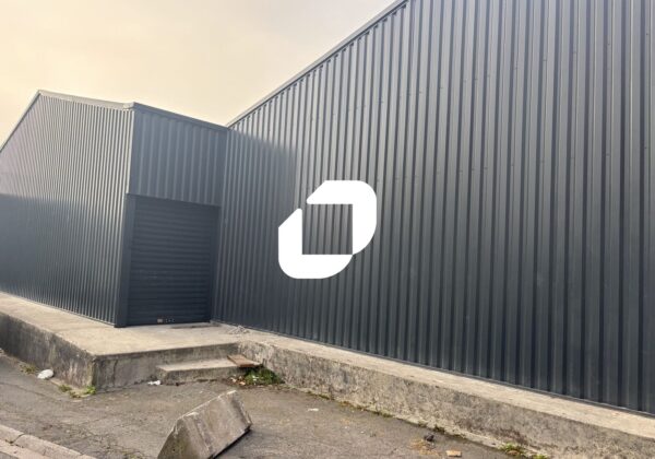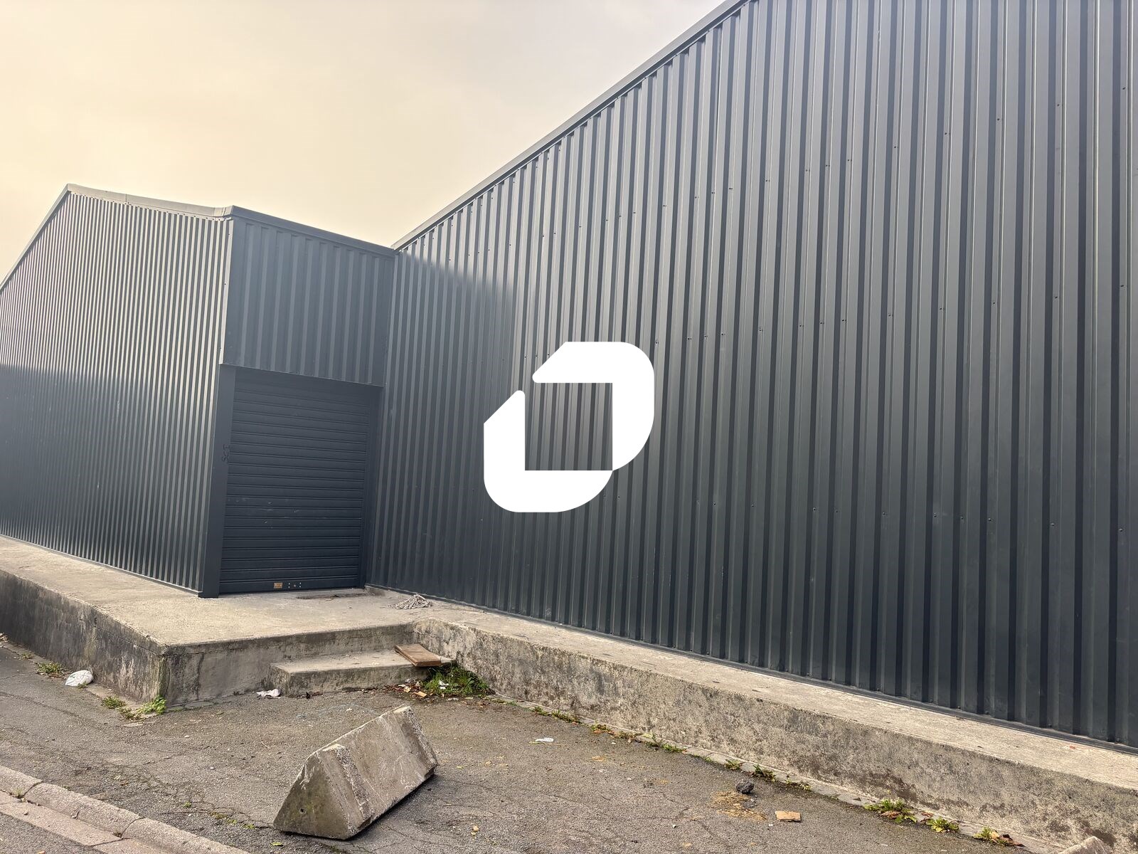 . Façade en bardage. Aire de manoeuvre (moyens et gros porteurs) . Locaux livrés brut de béton, fluides en attente