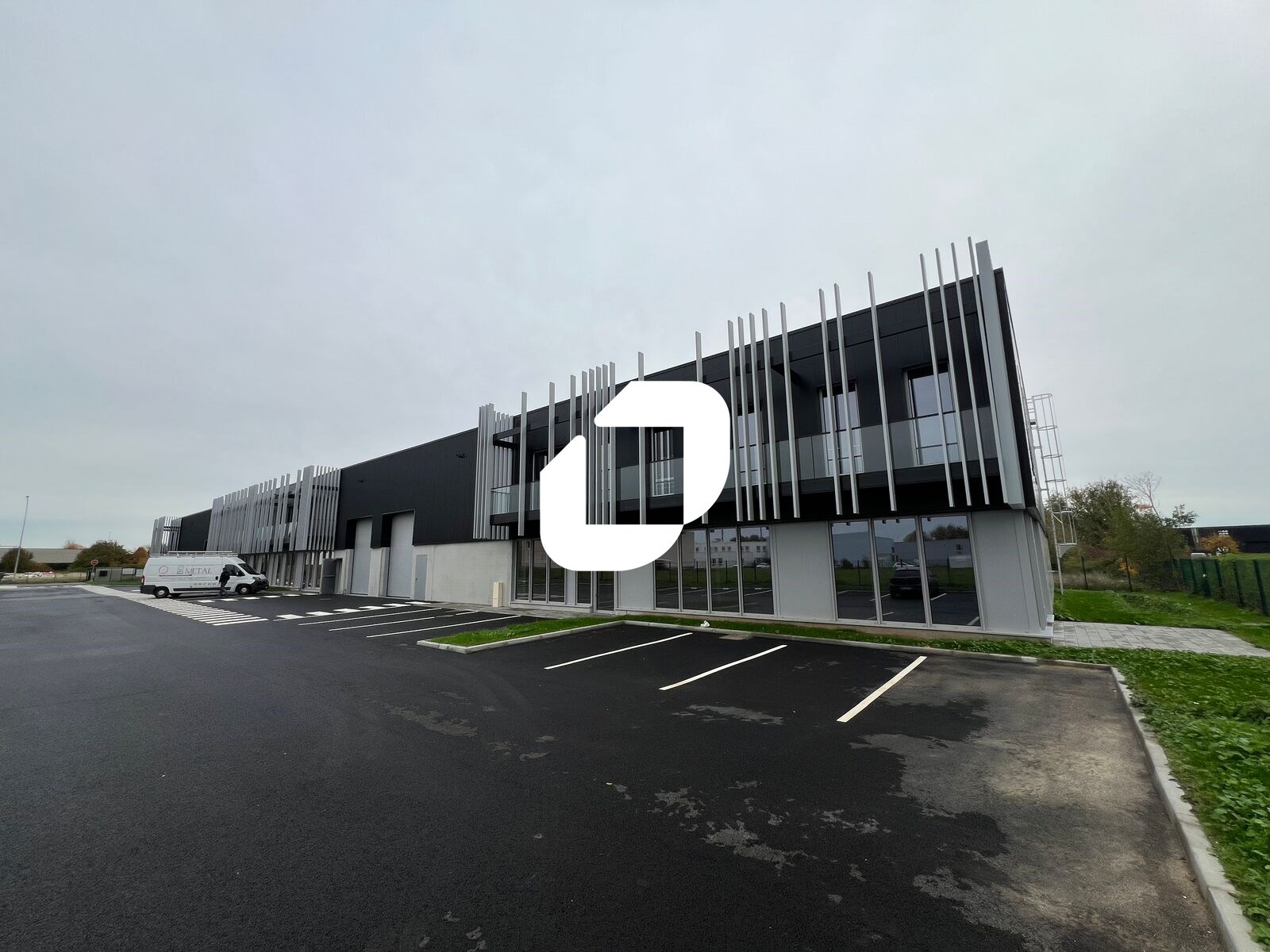 . Façade bardage et béton. Accès véhicules légers